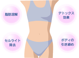 ボディでは、脂肪溶解、セルライト除去などのデトックス効果や基礎代謝が改善されることで目に見える痩身効果を実感できます。施術後、すぐに実感できる引き締め効果と長い持続性が特徴です。